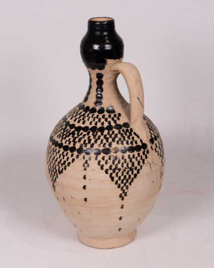 This is a unique, hand-painted ceramic water jug. The jug features a cream-coloured base with striking black hand-painted decorative detailing. It's a primitive style piece with a rounded body, a slender neck, and a bulbous top finished in black, as well as a simple handle. There may be some imperfections in the paintwork due to its handpainted nature, but this only adds to its rustic charm and character. This item is in good condition and would make a charming addition to any kitchen or dining space.