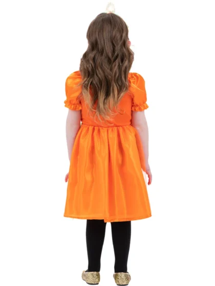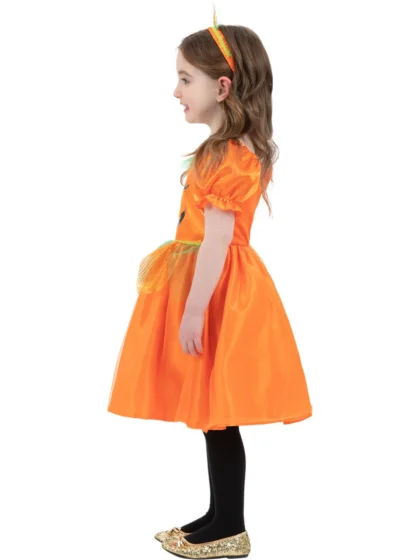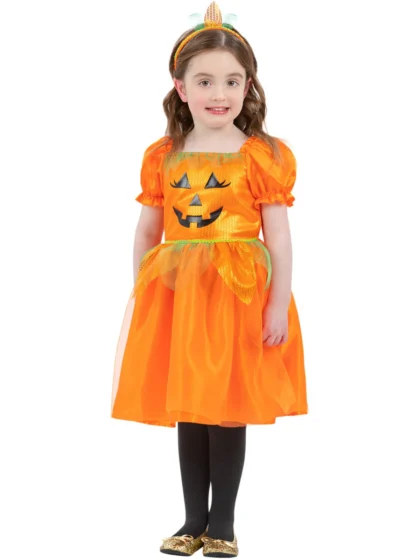 Dress your little one in this adorable brand new pumpkin dress costume. The vibrant orange dress features a black pumpkin face design on the bodice and green trim details. The set includes a matching headband to complete the festive look. Perfect for Halloween parties, trick-or-treating, or dress-up occasions. This delightful costume is sure to bring smiles and create memorable moments.