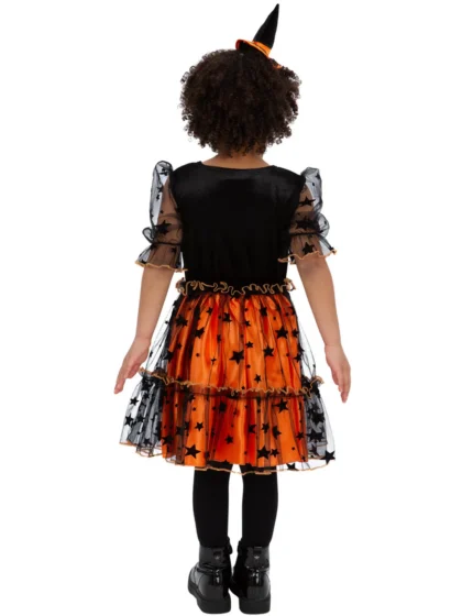 This pumpkin dress, features a black top with an orange pumpkin face and an orange skirt adorned with black stars. Ruffled trim adds a touch of charm. The set includes a matching headband with a mini witch hat. Made from comfortable, lightweight fabric, this dress is perfect for trick-or-treating or Halloween parties. The short sleeves are sheer with ruffled elasticated cuffs.