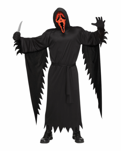 Transform into a chilling presence with the Pumpkin Ghost Face® Scream Costume. This set includes a striking orange and black mask, a hooded robe with jagged edges, a belt, and gloves. Designed to fit individuals up to 6′ tall and 200 lbs, the hard propylene face mask completes the haunting look. Please note, costumes are non-returnable.