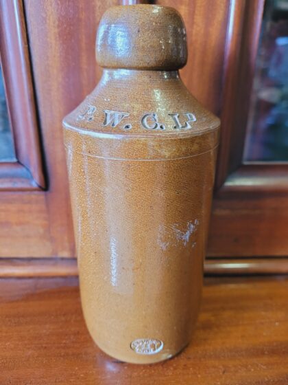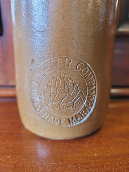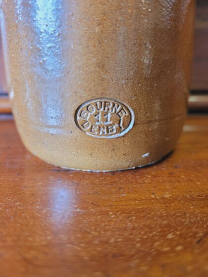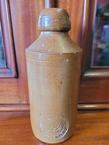 A brown glazed stoneware bottle. Bears impressed lettering which reads, "Pure Water Company Trade Mark". Bears impressed Bourne Denby maker's mark.