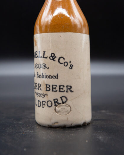 A two-tone stoneware bottle for Purnell & Co's Olde Fashioned Ginger Beer Guildford. Bears impressed Bourne Denby maker's mark.