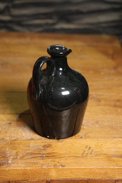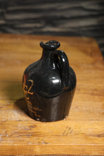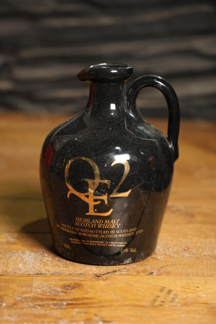 Black glazed ceramic flagon with gilt lettering for QE2 Highland Malt Scotch Whisky.