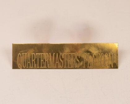 Vintage brass 'QUARTERMASTERS PLATOON' sign. Polished finish, clear engraving. Ideal for military memorabilia collectors.