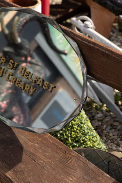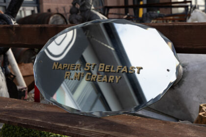 A mirror with gilt lettering which reads, "Napier St. Belfast R. McCreary". From the Belfast Directory "37 Napier Street, off Sandy Row, Belfast City Tramways - Chief Depot & Offices - R. McCreary, general manager and engineer"