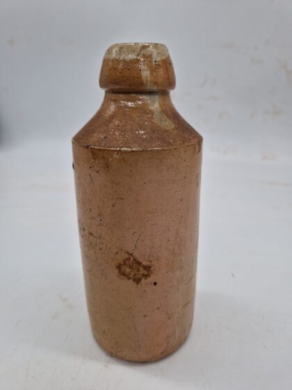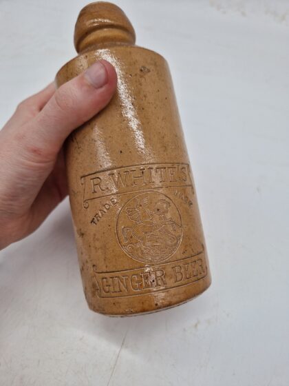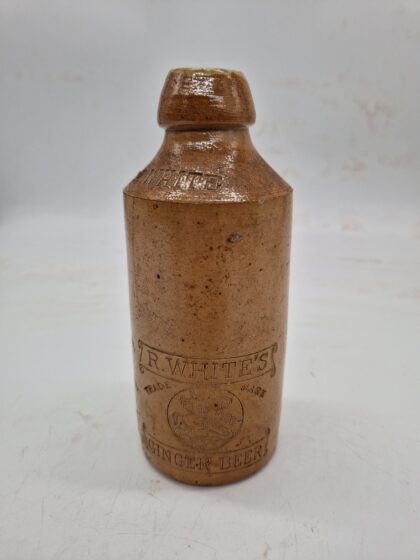 A brown glazed stoneware bottle bearing impressed lettering which reads, "R. White's Ginger Beer Trade Mark".