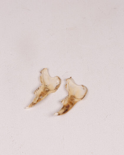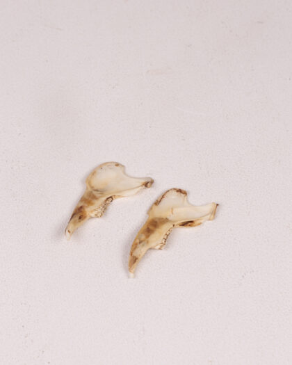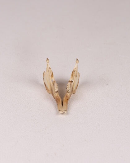 This is a small jaw bone from a rodent or other small animal. It has two visible incisors, and then the molars further back in the jaw. It is cream coloured with some brown discolouration in places, presumably caused by the environment it was discovered in. It would make a fascinating educational piece or a unique decorative item.