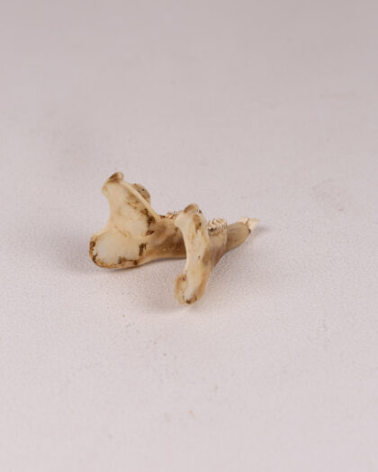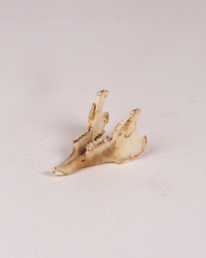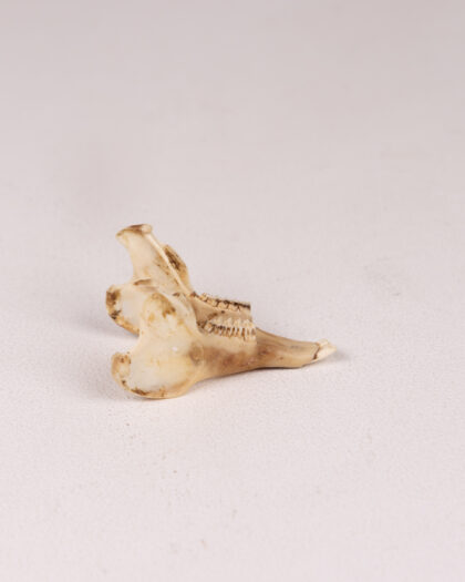 Small animal jaw bone with teeth. Cream and brown in colour. Could be used for educational purposes or as a decorative item.