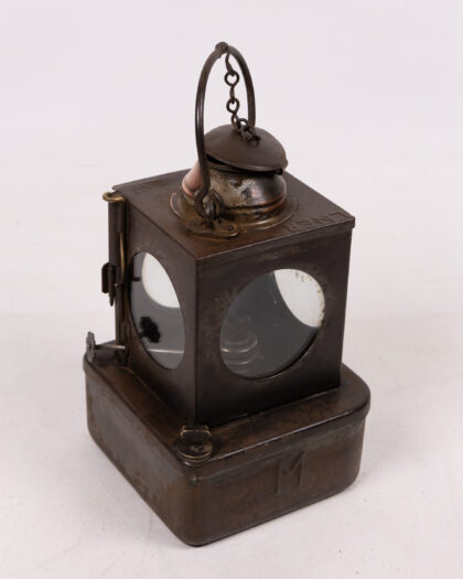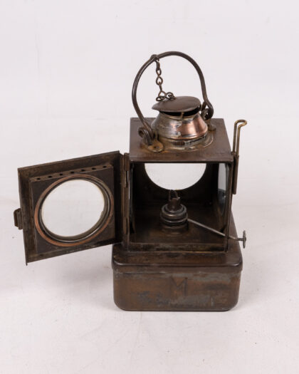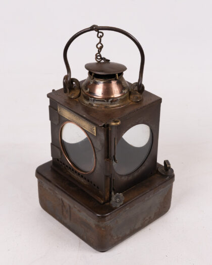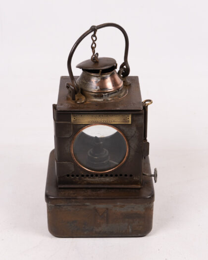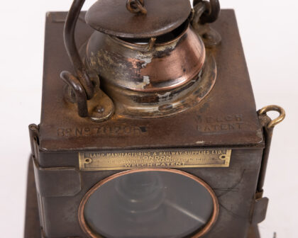 This (1920s/1930s) railway lamp was manufactured by Lamp Manufacturing & Railway Supplies Ltd, London. It is of the Welch Patent design. It has a solid metal construction and a sturdy metal carry handle. This lamp is weathered and tarnished, but still a great piece of railway history. Add it to a collection or use it as a unique piece of vintage décor.