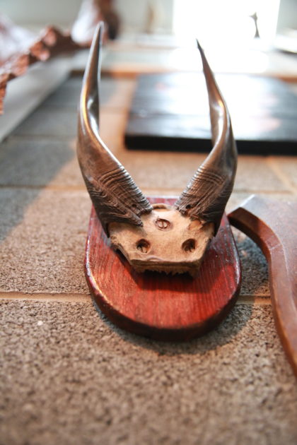 Authentic vintage ram skull featuring impressive large horns, mounted on a rustic wooden shield. A unique decorative piece for any interior.