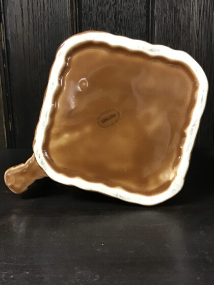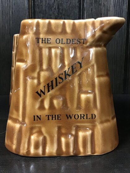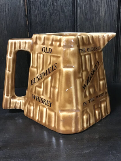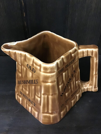 A brown glazer ceramic bartop water jug. Bears black lettering that reads "Old Bushmills Whiskey" on two sides and, "The Oldest Whiskey In The World" on two sides. Made by Arklow Ireland and bears black backstamp to base.