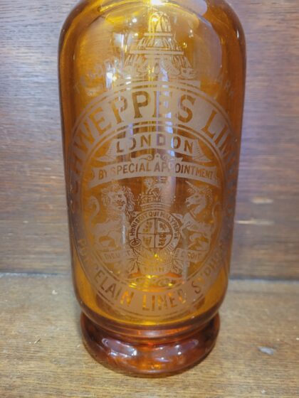 An amber glass soda syphon with chrome top. Bears etched lettering which reads, “Schweppes Limited Porcelain Lined Syphon”. Has some damage to base (shown in images).