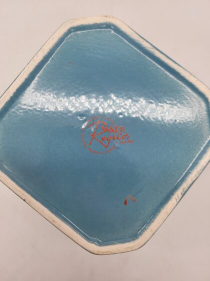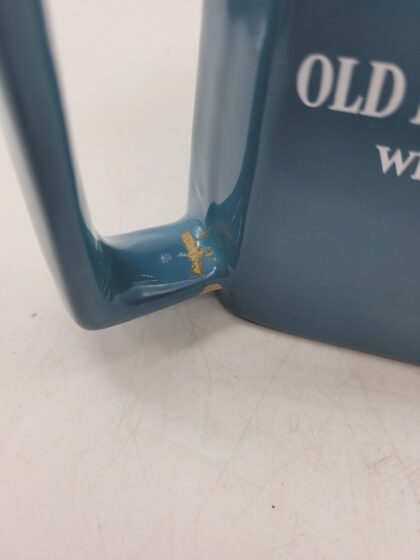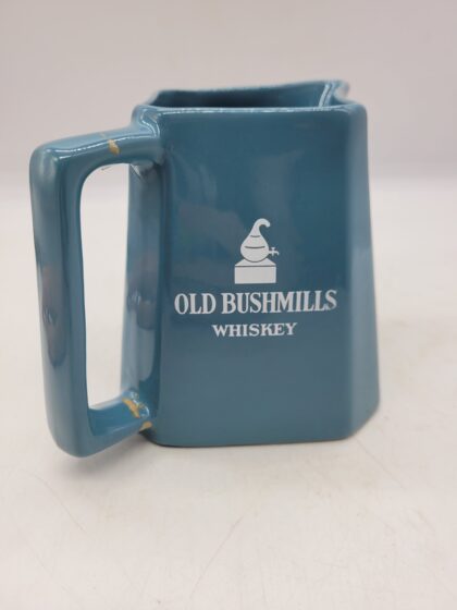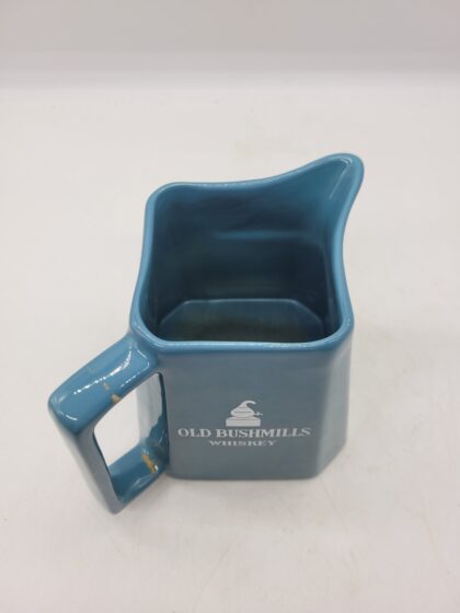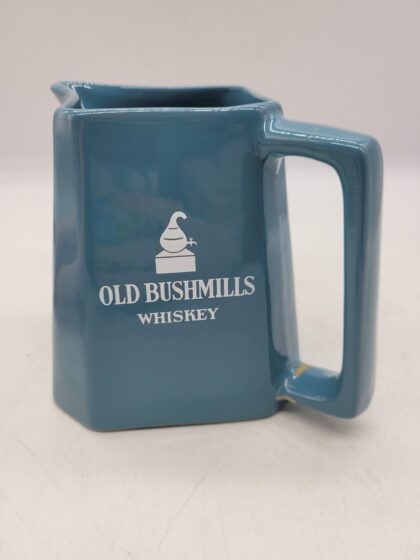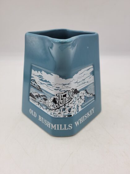 A blue glazed ceramic bartop water jug. Bears white lettering that reads, "Old Bushmills Whiskey" and a picture of The Giant's Causeway. Made by Wade and bears red backstamp to base. Handle has been damaged and repaired.