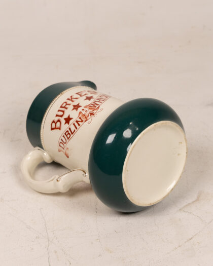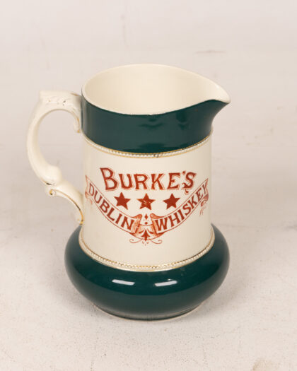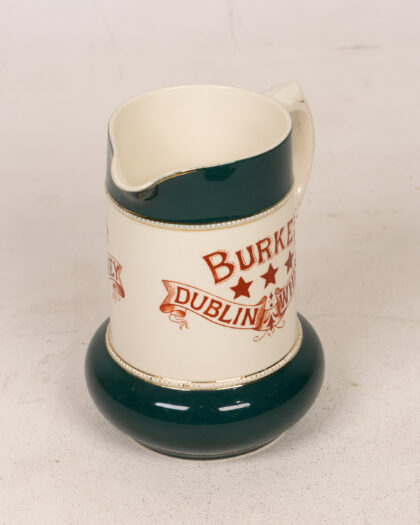 Vintage Burke's Dublin Whiskey jug with green & cream design, red lettering, gold trim. Good condition. Ideal for collectors.