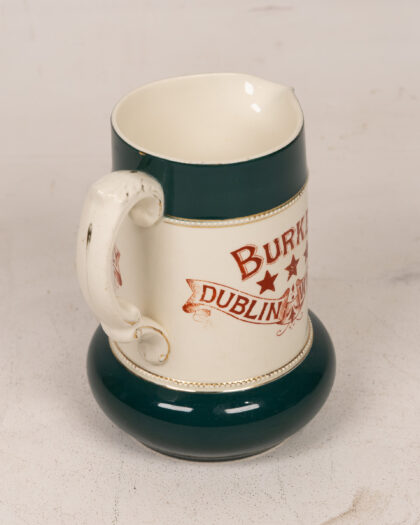 Charming vintage Burke's Dublin Whiskey jug. Features a cream-colored body with green accents at the top and base. The jug prominently displays 'Burke's Dublin Whiskey' in red lettering with three red stars. Gold trim highlights the edges. The handle is cream-colored with a decorative design. Shows some age-related wear, but overall in good condition for its age. Perfect for a collector or as a decorative piece in a home bar.