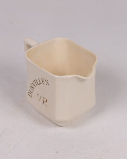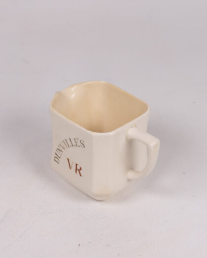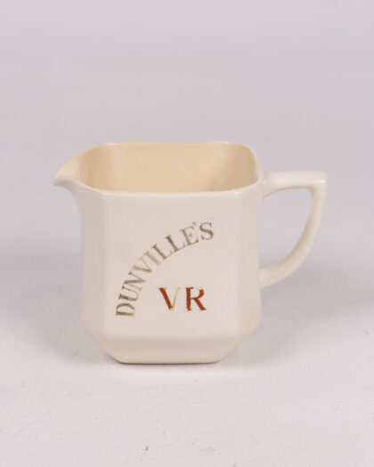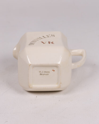 Dunville's VR Belfast advertising whisky jug. Features the Dunville's VR logo in gold lettering. Made by W.J. Irvine, Belfast, as indicated on the base. Cream colored ceramic with square shape. Ideal for collectors of Irish whiskey memorabilia or vintage advertising items. In good vintage condition with some minor wear commensurate with age.