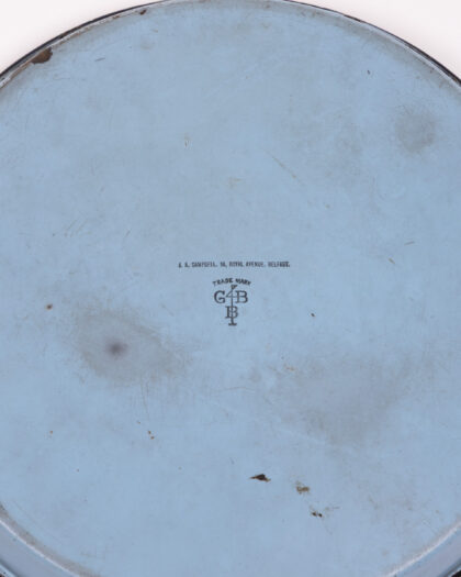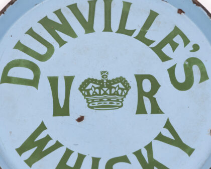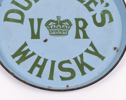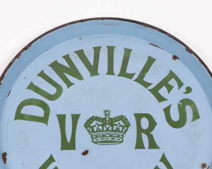 Dunville's V.R. Whisky round enamel tray. Features a light blue background with green lettering and a crown. Some wear and tear around the edges add to its authentic vintage appeal. On the back is J. A. Campbell, 5A Royal Avenue, Belfast. A great piece of barware to add to a collection, or to use as a decorative tray. The wear gives it a beautiful patina and historical feel.