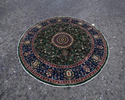 Discover the allure of this exceptionally rare Afghan circular rug, featuring a stunning green ground with intricate double knot craftsmanship. Made from 100% wool, it offers a luxurious full pile, providing both comfort and elegance. Perfect for adding a touch of sophistication to any space, this 200cm diameter rug showcases a rich palette of green, blue, and red with ornate floral and geometric patterns.