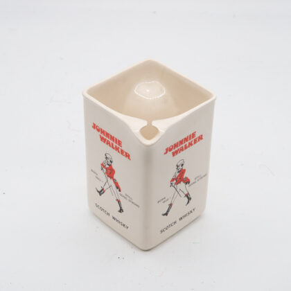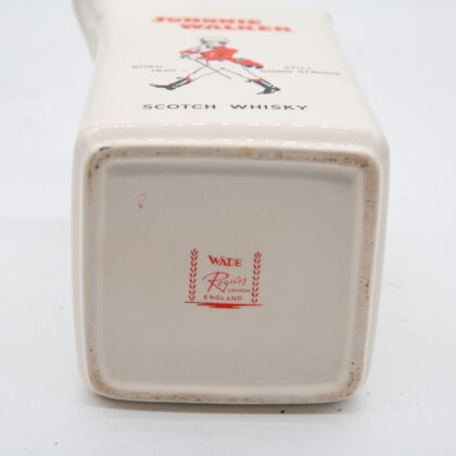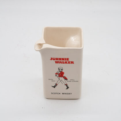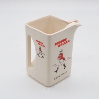 A white glazed ceramic water jug bearing red and black lettering which reads, "Johnnie Walker Scotch Whisky Born 1820- Still Going Strong" on all four sides. Made by Wade and bears red backstamp to base.