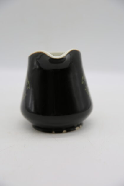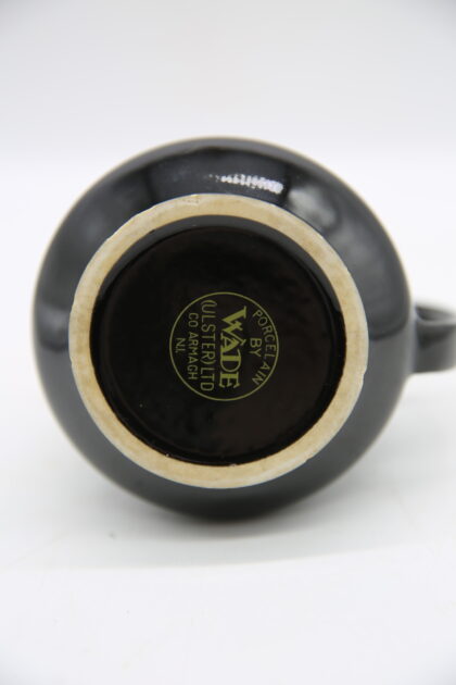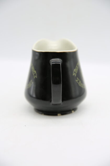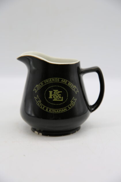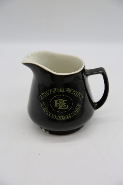 A black glazed ceramic bartop water jug. Bears yellow lettering which reads, "Old Friends are Best Lyle & Kinahan Ltd.". Made by Wade Ulster and bears yellow backstamp to base.