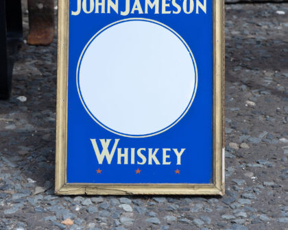 Rare mall John Jameson Whiskey advertising mirror featuring a blue background with "John Jameson" and "Whiskey" in gold lettering. The sign has a central white mirror section and is framed in a gold-coloured ornate frame. There are a few scratches on the frame and background. This distinctive piece would make a great addition to any home bar or whiskey collection.