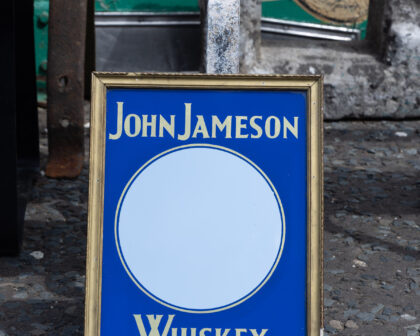 Rare John Jameson Whiskey small advertising mirror with a blue background and a gold-coloured frame. Ideal for a home bar or whiskey collection.
