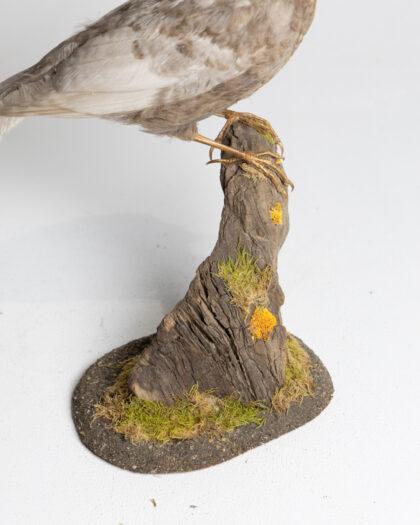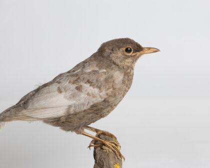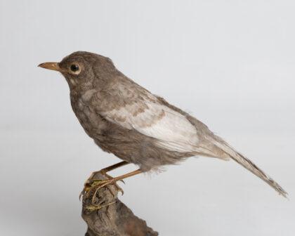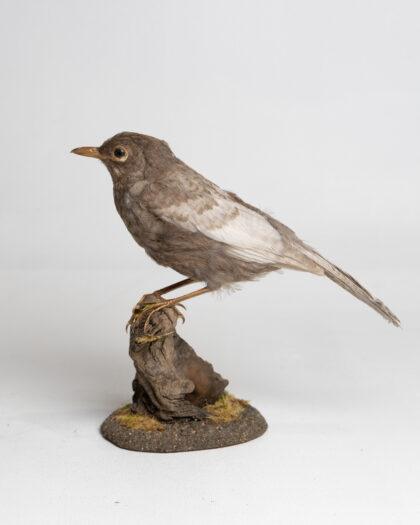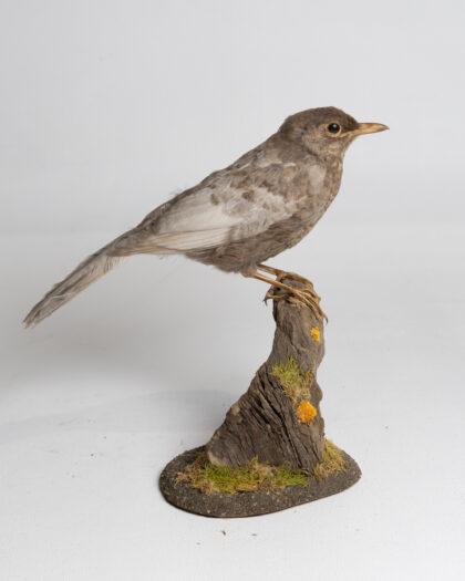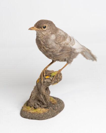 This is a meticulously crafted and rare taxidermy grey blackbird, mounted on a natural-looking base with moss and lichen details. The bird is in excellent condition, showcasing detailed feather work and realistic posture. Ideal for collectors or as a unique decorative piece.