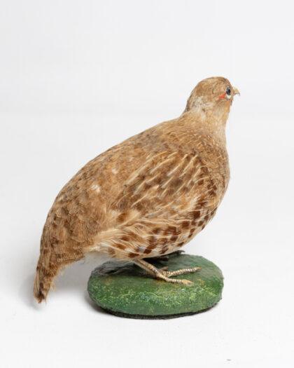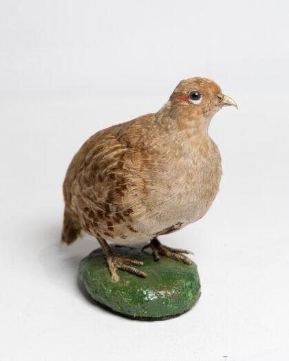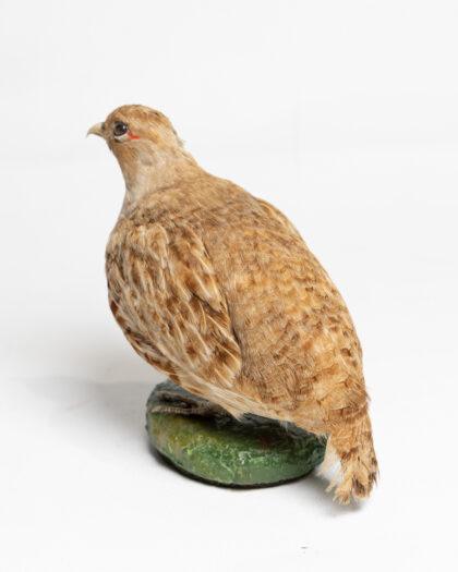 This beautiful taxidermy partridge is mounted on a green base. The craftsmanship highlights the intricate details of the bird's feathers and pale colouring, making it an ideal piece for display in a collection or as a unique decorative item.