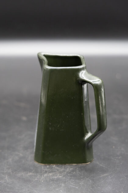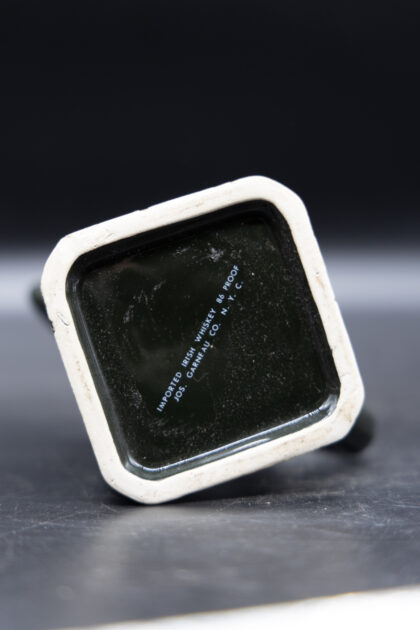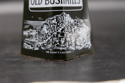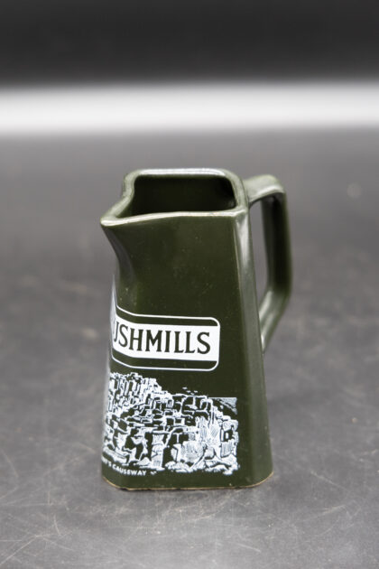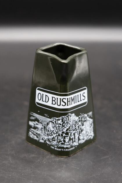A black ceramic bartop water jug. This jug was only produced for America. It reads, “Old Bushmills The Giant’s Causeway”.
