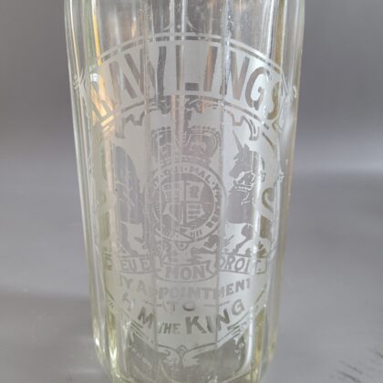 A clear glass soda syphon with plastic top. Bears etched lettering which reads, “Rawlings Dieu et mon Droit By Appointment to H M the King”.
