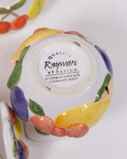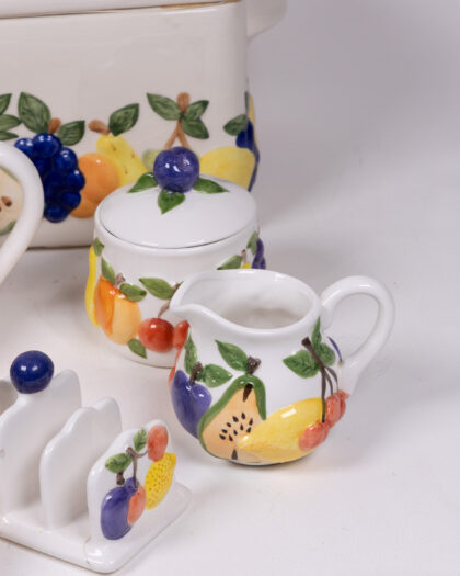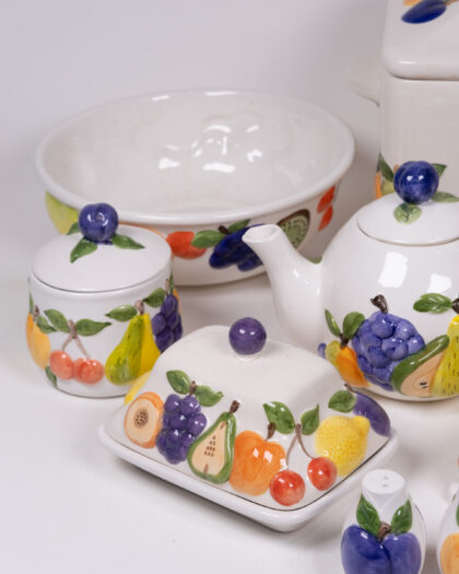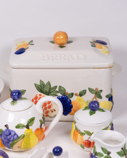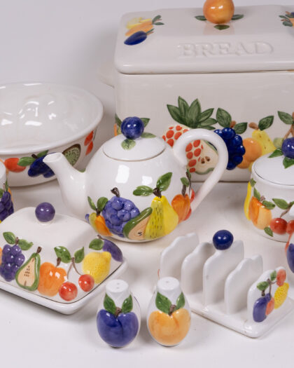 Charming 10-piece Rayware By Design ceramic kitchenware set with vibrant fruit motif. Includes teapot, bread bin, toast rack, and more. Perfect for a cheerful kitchen.