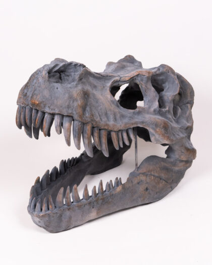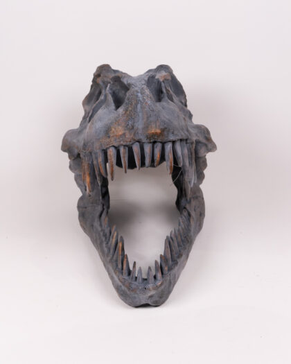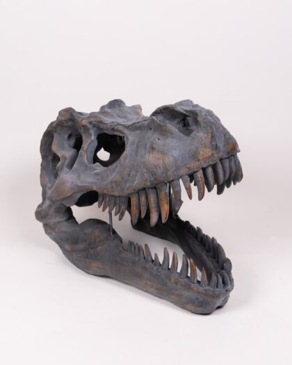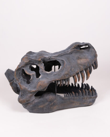 Realistic T-Rex Dinosaur Skull Replica. Grey and brown finish. Great for collectors, dinosaur enthusiasts, or unusual decor. Perfect for Halloween.