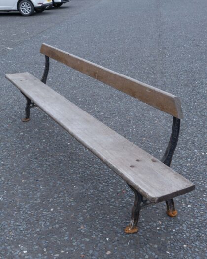Vintage A.P. Corry & Co. Belfast reclaimed garden bench with weathered wood & embossed cast iron legs. Rustic outdoor charm.