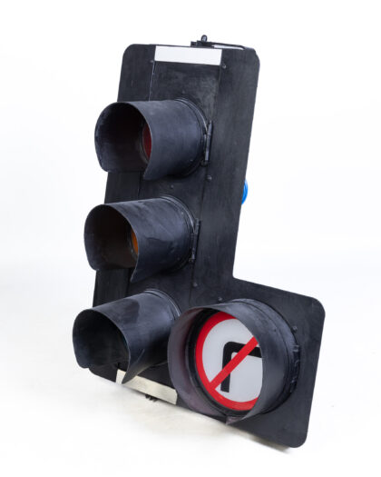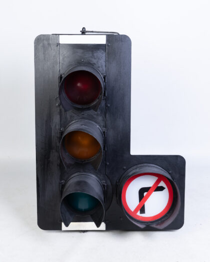 Quirky reclaimed traffic light with a 'no right turn' signal. Ideal for adding industrial flair to any space. Rewired for UK use.