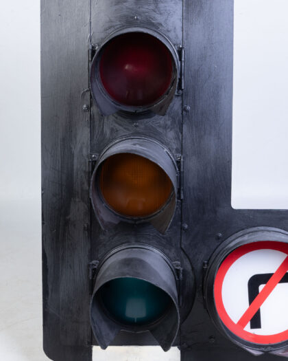 Bring quirky industrial flair to any space with this reclaimed traffic light. It features the standard red, amber, and green lights, a 'no right turn' signal and sits on a black metal frame. Ideal for adding a unique touch to a games room, home bar, garage, or quirky office space. The light is in good reclaimed condition, though it may show signs of wear consistent with age and previous use. It has been wired for domestic use with a standard UK plug.