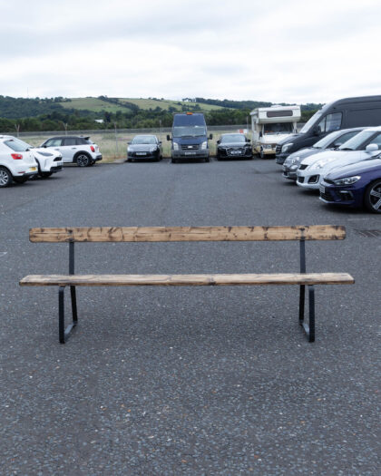 Add an authentic rustic or industrial touch to any space with this reclaimed wood and metal bench, complete with a supportive backrest.