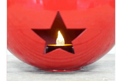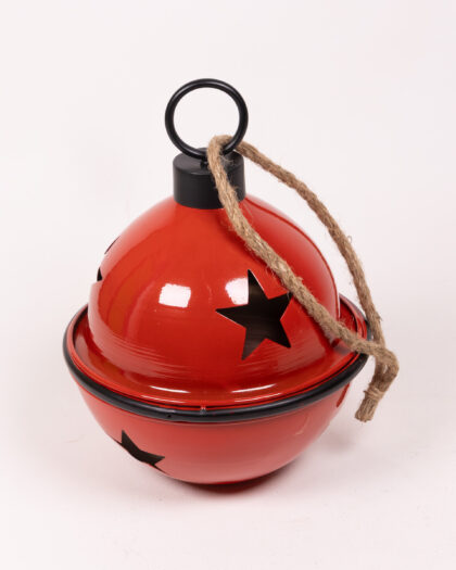 Festive red Christmas bauble lantern with star cutouts, black accents, and rope handle. Perfect for adding a warm glow to your home this Christmas.