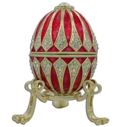 Inspired by jeweled Imperial eggs, this new trinket box is crafted from pewter and features radiant red enamel panels framed in elegant gold tone. Crystal accents add sparkle to the ornate design. The hinged egg opens and closes with a magnetic closure. The interior is lined with padded satin. Historically, these eggs were commissioned as Easter gifts for royalty and nobility, crafted from precious metals and detailed with intricate enamel techniques. This 3.25 inch egg echoes that tradition. Perfect for display on a mantelpiece.