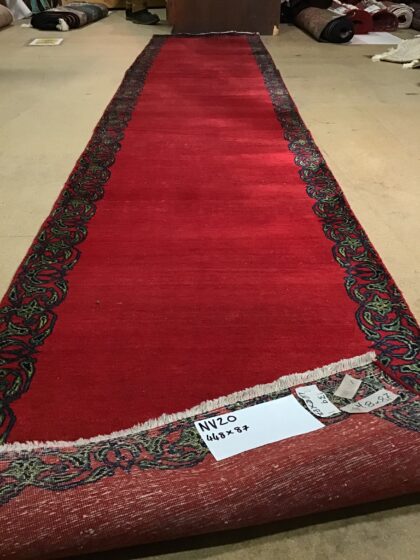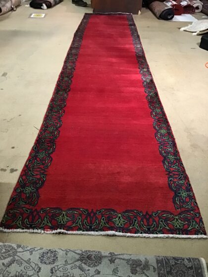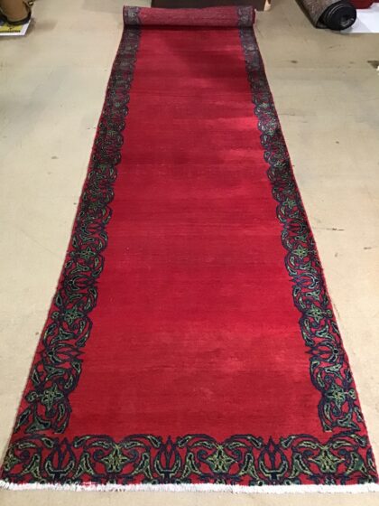 Deep pile red ground, fine woven Persian Kerman runner with all over plainfield and floral border.