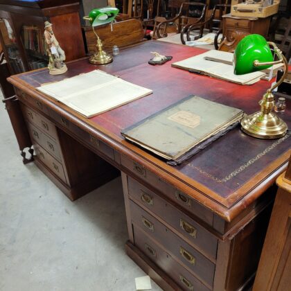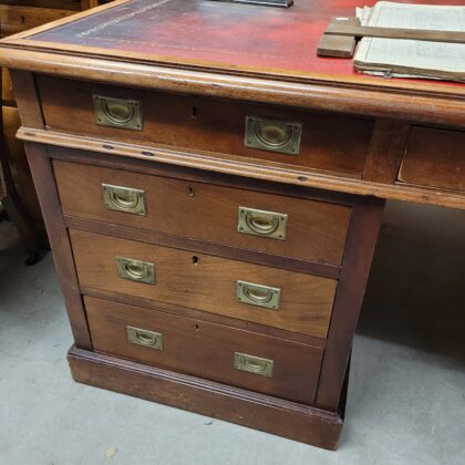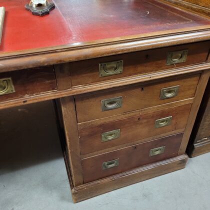 A large two person desk with a red leather desktop. Sets of drawers on both sides.