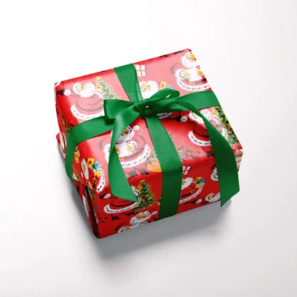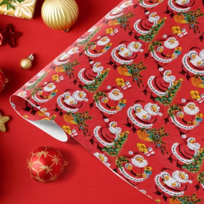 Festive Christmas wrapping paper featuring a Santa Claus design. Perfect for adding a touch of holiday cheer to your gifts.