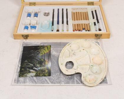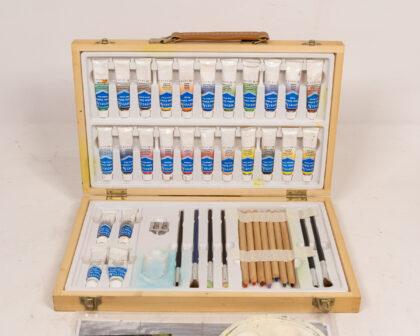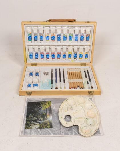 Complete Reeves painting set in wooden case. Includes paints, brushes, palette & more. Good condition, ideal for artists!