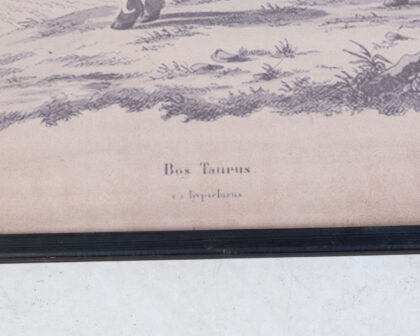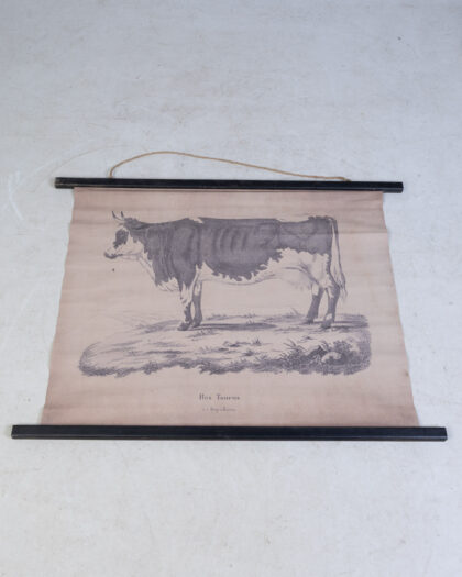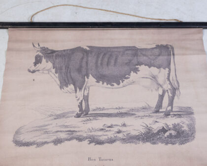 Reproduction 'Bos Taurus' print. Printed with wooden supports and string for hanging. Perfect for a touch of vintage style charm.