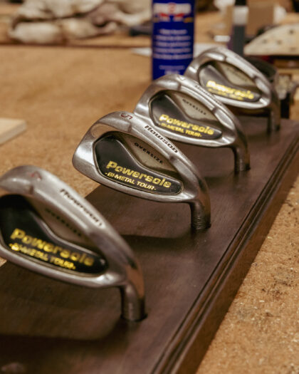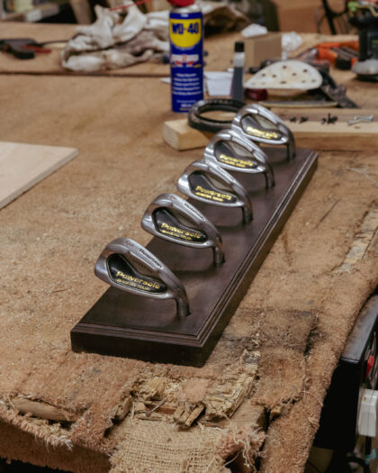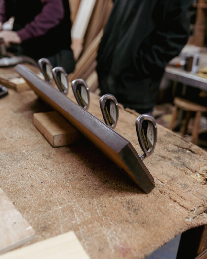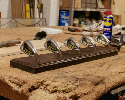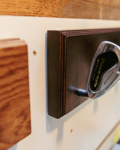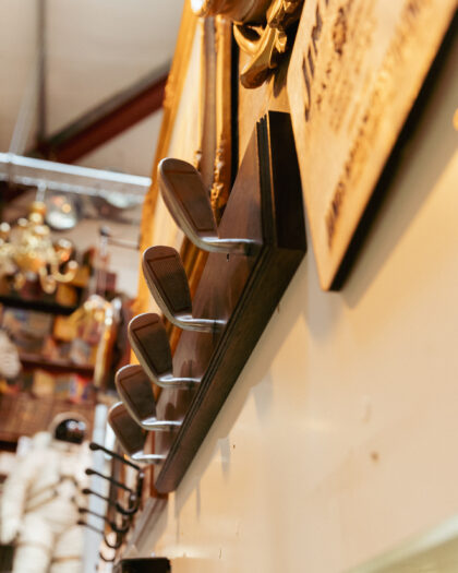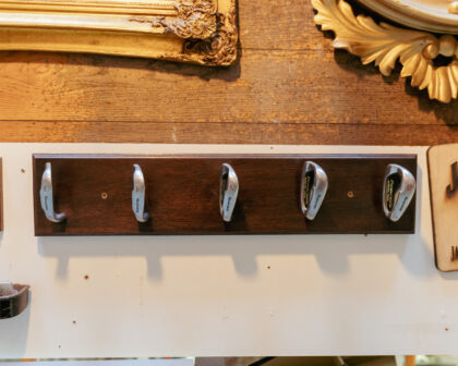 A five hook coat and hat rack handmade in the On The Square Workshop from repurposed golf clubs! A one of a kind piece.