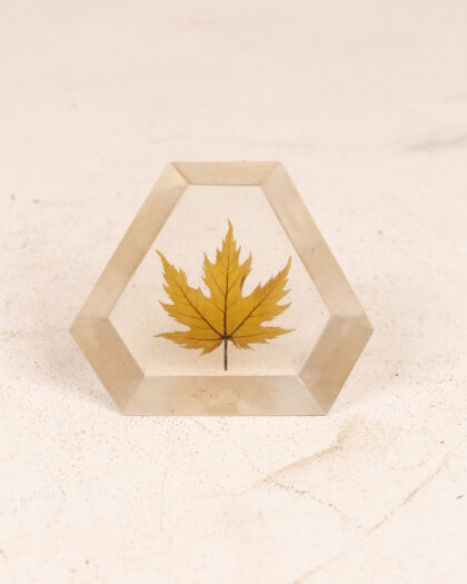 Resin hexagon ornament / paperweight with real, dried maple leaf. A unique and natural decorative accent for any room. Great displayed on shelves or windowsills.