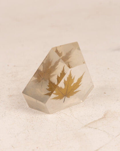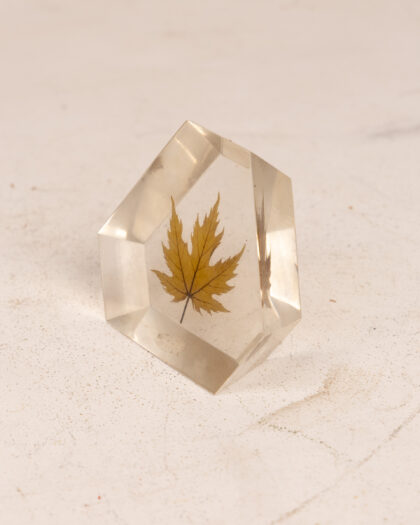 A decorative ornament / paperweight featuring a real, dried leaf encased in clear resin. The resin is shaped into a hexagonal prism, creating a unique and eye-catching display piece. The leaf is a golden yellow colour, providing a touch of natural warmth and autumnal charm. This ornament would make a lovely addition to a desk, shelf, or windowsill, bringing a bit of the outdoors inside. It is in good condition.