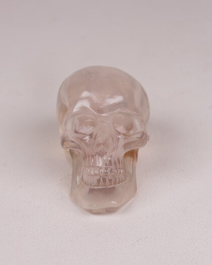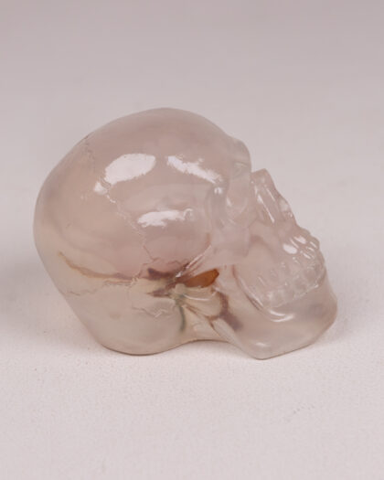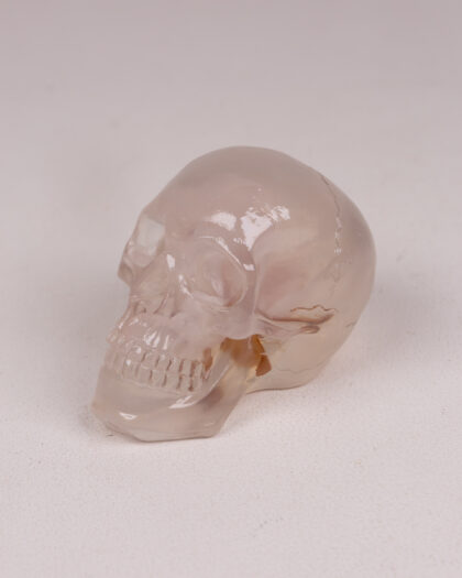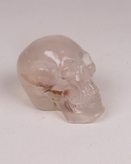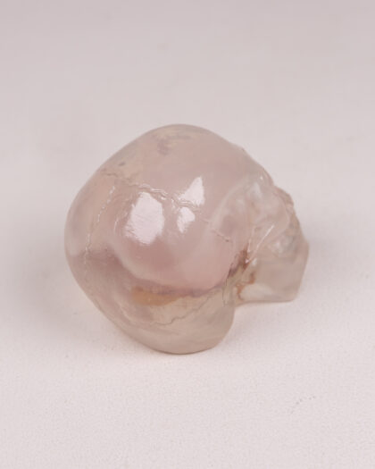 A realistically shaped skull ornament made from pale purple and clear resin. The resin is translucent, allowing light to pass through, and has a smooth polished finish. An interesting decorative piece for a desk, shelf, or cabinet, this skull would make a unique addition to any skull collection or gothic-inspired decor. Very good condition.