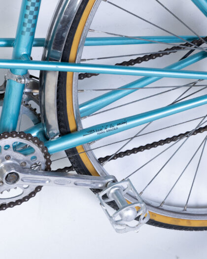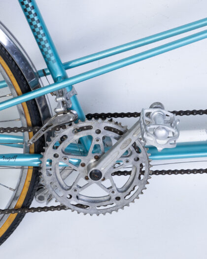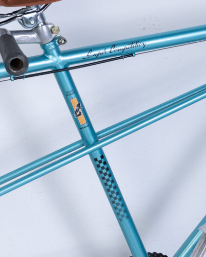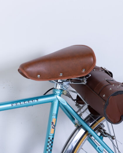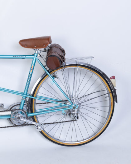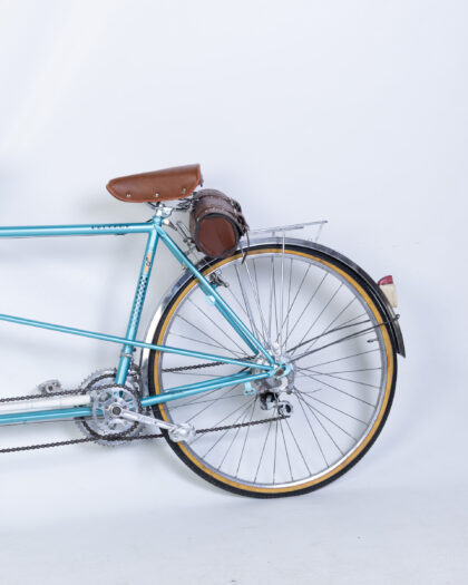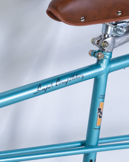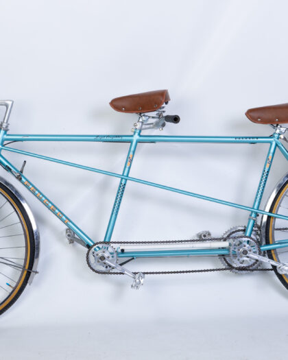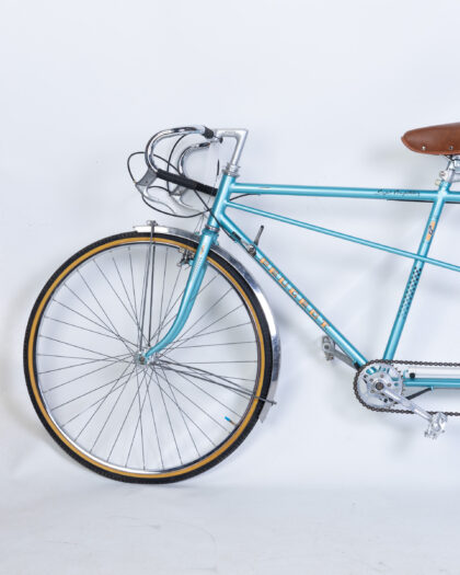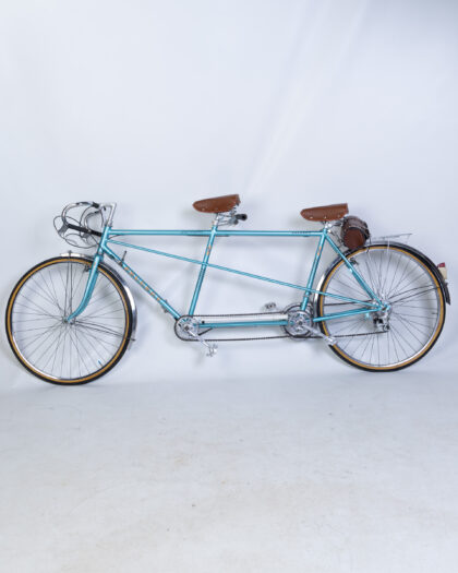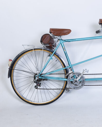 Fully restored Vintage Peugeot Tandem Bicycle with a vibrant turquoise frame and classic brown leather seats. Made in France.