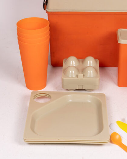 Vintage Laplast picnic set with orange, cream, yellow and white plastic containers, plates, cups and cutlery, perfect for retro outdoor dining.
