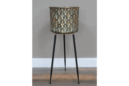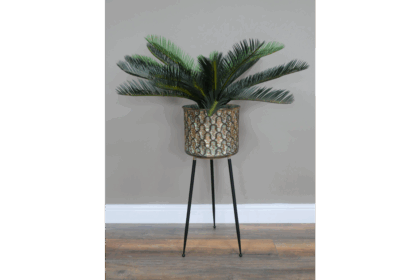 Add a touch of retro style to your home with this plant stand. Featuring a textured brown and turquoise cylindrical pot, supported by sleek black metal hairpin legs, this stand brings a mid-century modern vibe to any space. The artificial plant inside adds a touch of greenery without the need for maintenance. The pot has a mosaic style pattern and looks to be made of metal. This item would look great in any living space, and will add a touch of contemporary style to your home. Condition is excellent.
